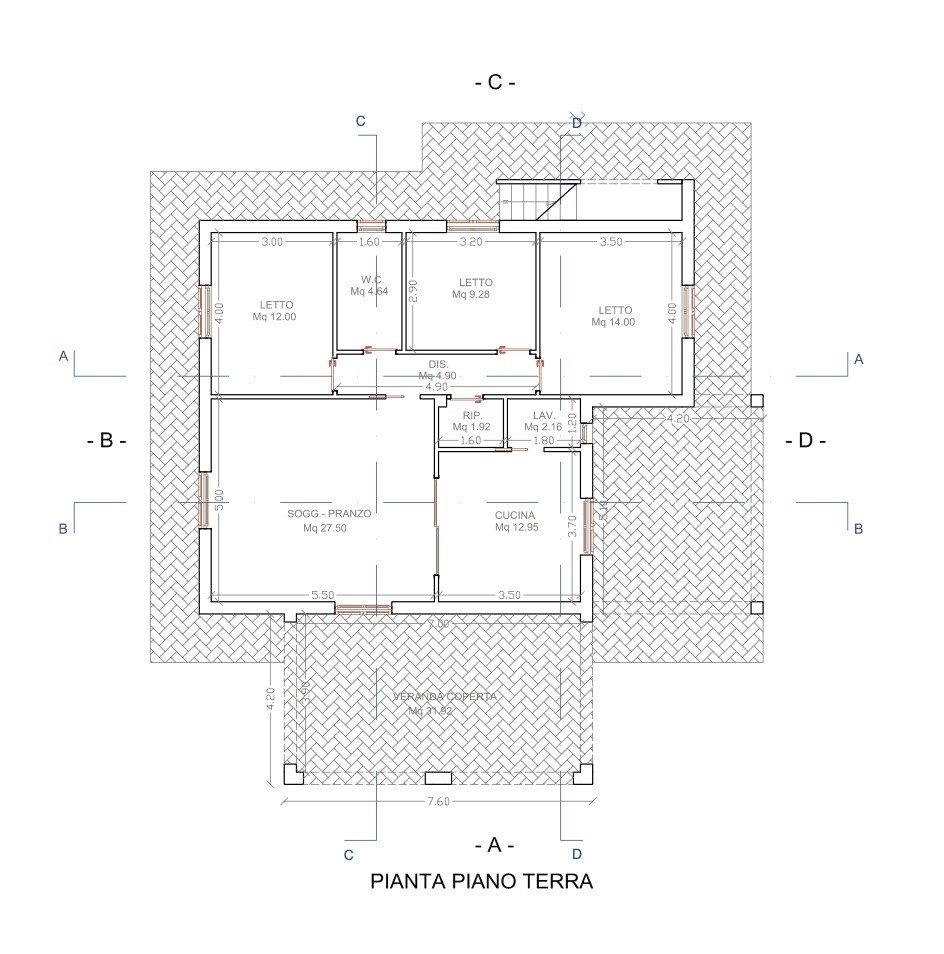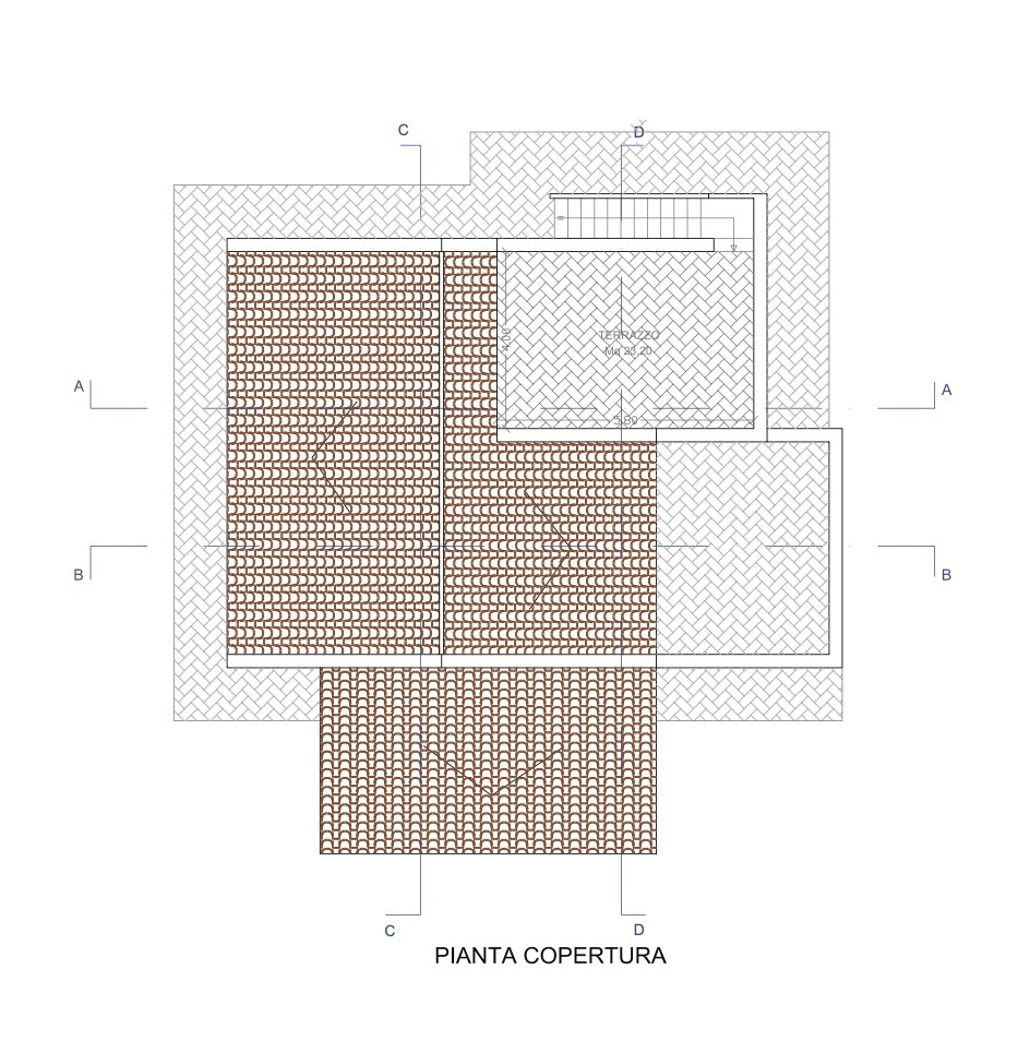 La villa, attualmente allo stato grezzo, ha una superficie di circa 100 mq ed è progettata per ospitare un soggiorno, una cucina, tre camere da letto, un corridoio, due bagni e una lavanderia. È prevista una veranda coperta di circa 32 mq e un pergolato; tramite una scala esterna in muratura si accede al terrazzo del primo piano di circa 25 mq.