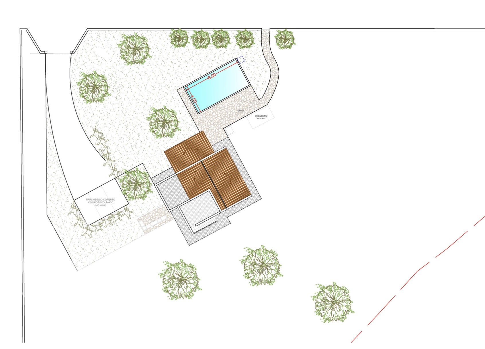 Il progetto prevede inoltre la realizzazione di una zona barbecue, una piscina di 8×4 metri e un’area parcheggio con posto auto coperto, da completare secondo le proprie esigenze e finiture.